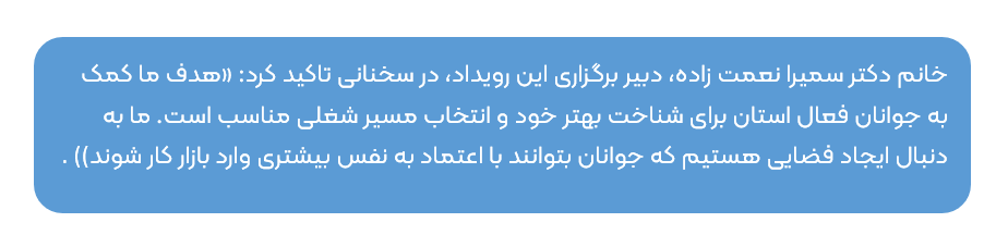 این رویداد که با استقبال گسترده بیش از 33 نفر از جوانان استان برگزار گردید ، شرکتکنندگان با انجام آزمونهای مختلف استعدادیابی از جمله شخصیت شناسی 16 عاملی کتل، رغبت سنجی شغلی استرانگ و شخصیت کارآفرینی EPT، تواناییها و علایق خود را شناسایی کرده و در پایان گزارش مکتوبی از تحلیل و تفسیر آزمون های انجام شده در اختیار شرکت کنندگان قرارداده شد.