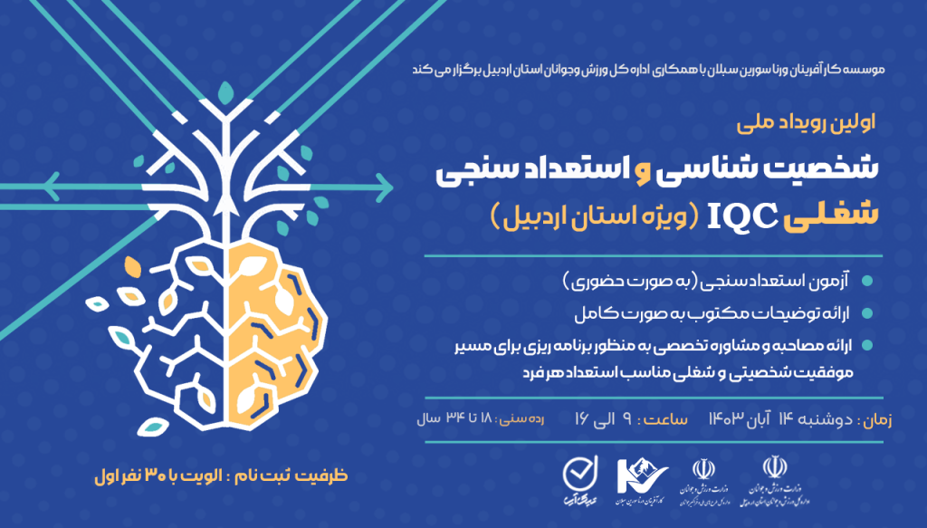 به نقل از روابط عمومی موسسه کارآفرینان ورنا سورین سبلان؛ بهمنظور شناسایی و سنجش استعدادهای جوانان 18 تا35 سال و ارائه مشاورههای شغلی، اولین رویداد ملی شخصیت شناسی و استعدادسنجی شغلی IQC ویژه استان اردبیل با همکاری و نظارت اداره کل ورزش و جوانان استان اردبیل، دفتر مدیر کل طرح های ملی و فراگیر وزارت ورزش و جوانان و مرکز مشاوره، خدمات کارآفرینی و شتابدهنده تیک آپ، با حضور علاقمندان و متخصصین این حوزه در تاریخ 14 آبان ماه1403 در محل مجتمع فرهنگی دیجیتالی فدک اردبیل برگزار شد. این رویداد با هدف ایجاد شناخت لازم از خصوصیات فردی، علاقه مندی ها و استعداد و توانایی هرشخص به منظور تسهیلگری مسیر جوانان جویای کار و مشاوره جهت ورود به بازار، به ویژه در شرایط اقتصادی کنونی، طراحی شده بود.